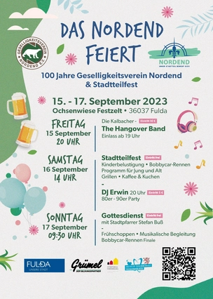 Alle Bewohnerinnen und Bewohner des Fuldaer Stadtquartiers Nordend sowie alle Interessierten erwartet von Freitag, 15. September, bis Sonntag, 17. September, auf der Ochsenwiese ein buntes Programm: Anlass ist nicht nur der 100. Geburtstag des Geselligkeitsvereins Nordend, sondern auch das Stadtteilfest im Rahmen des Städtebauförderprogramms „Sozialer Zusammenhalt“.