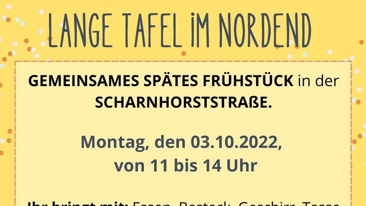 FULDA (nm). Am Montag, den 03. Oktober 2022, findet von 11.00 - 14.00 Uhr ein Nachbarschaftsfrühstück an einer langen Tafel in der Scharnhorststraße statt.