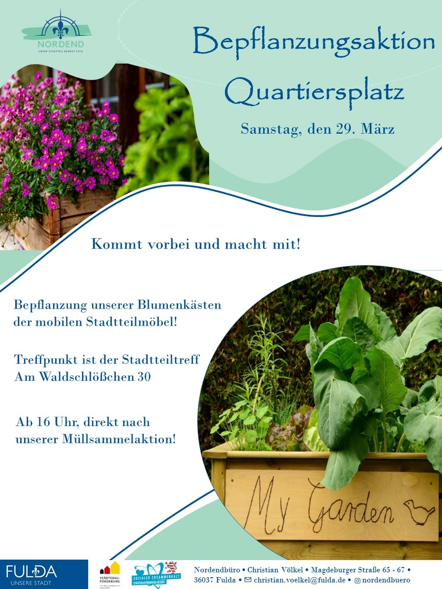 Ab 16 Uhr starten wir auf den Platz vor dem Stadtteiltreff und wollen zusammen die Blumenkästen der Stadtmöbel bepflanzen.