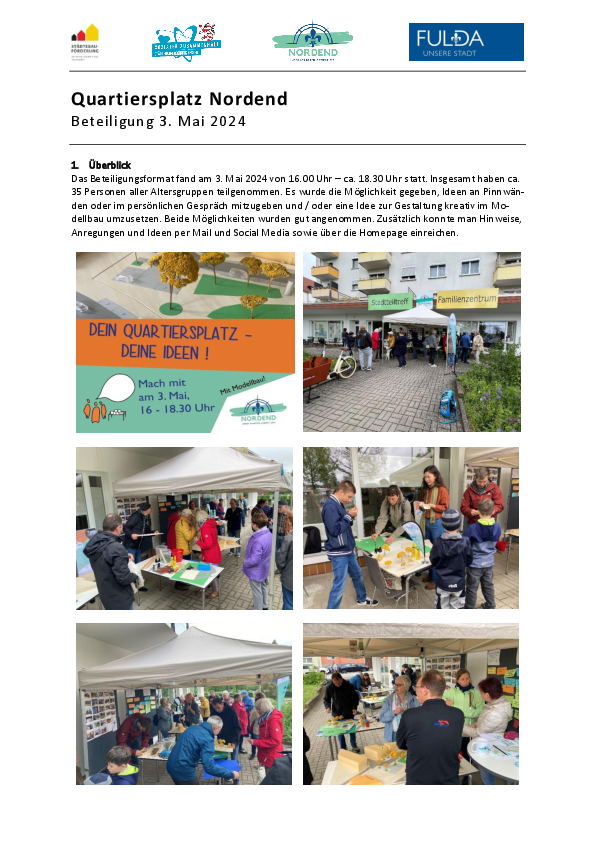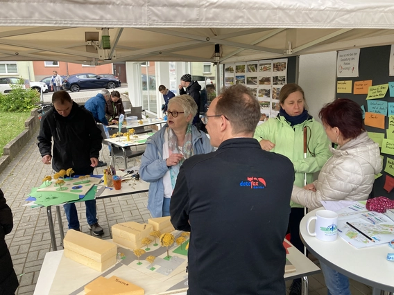 Das Beteiligungsformat fand am 3. Mai 2024 von 16.00 Uhr – ca. 18.30 Uhr statt. Insgesamt haben ca. 35 Personen aller Altersgruppen teilgenommen. Es wurde die Möglichkeit gegeben, Ideen an Pinnwänden oder im persönlichen Gespräch mitzugeben und / oder eine Idee zur Gestaltung kreativ im Modellbau umzusetzen. Beide Möglichkeiten wurden gut angenommen. Zusätzlich konnte man Hinweise, Anregungen und Ideen per Mail und Social Media sowie über die Homepage einreichen.