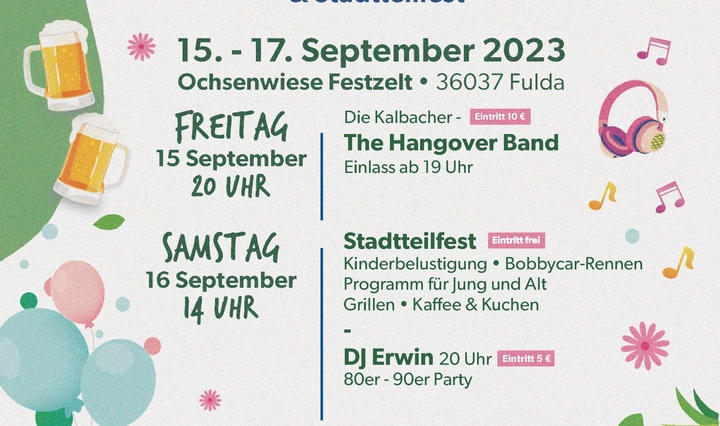 Buntes Programm auf der Ochsenwiese am 15. - 17. September: 100. Geburtstag des Geselligkeitsvereins Nordend und Stadtteilfest. Alle Bewohnerinnen und Bewohner sowie alle Interessierten sind herzlich eingeladen!