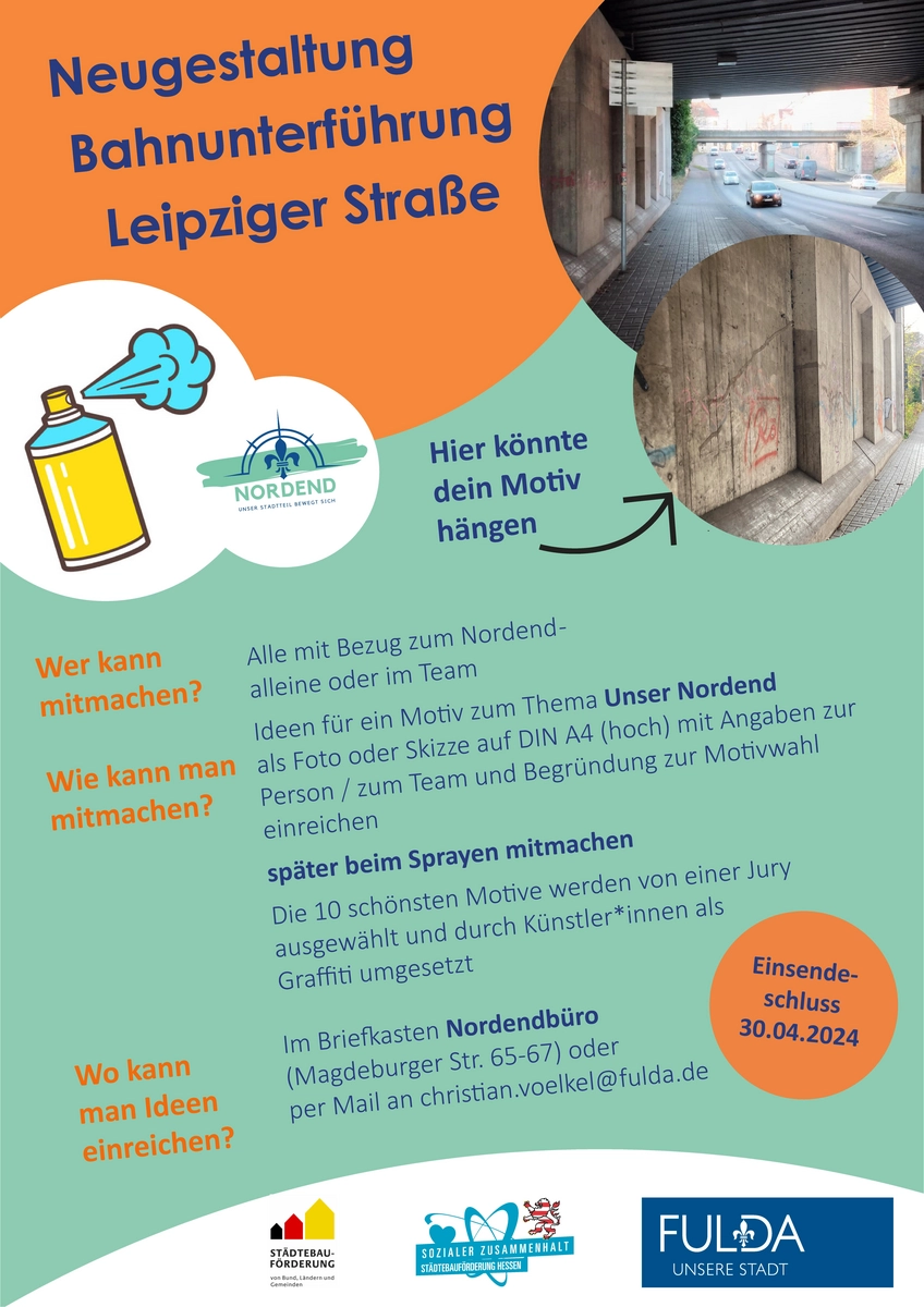 Es haben die Kita St.Joseph, das THW, der Jugendclub, die Marquardschule, die Feuerwehr, der Asta und der Geselligkeitsverein Nordend teilgenommen. Die Ergebnisse werden in den nächsten Wochen in der Bahnunterführung der Leipziger Straße angebracht.